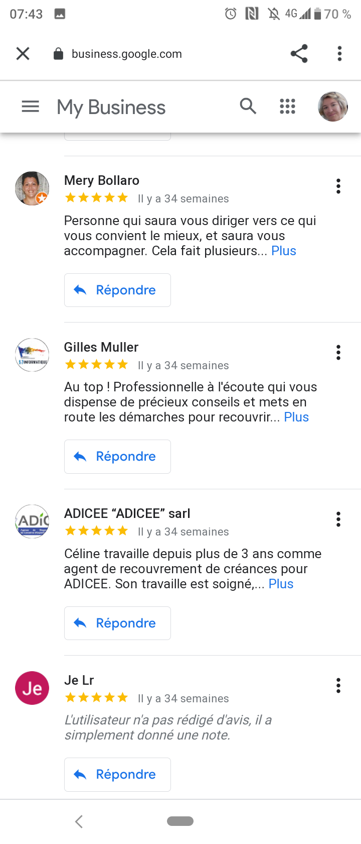Excellent cabinet ! Encore un grand merci Céline, pour toutes ces années de collaborations ! j'ai pu récupérer mes fonds dûs, grâce à ton sérieux et ton implication. Je te souhaite une très bonne continuation et n'hésiterai pas à te recommander à d'autres collègues. Prends bien soin de toi. Stéphanie Quédeville.